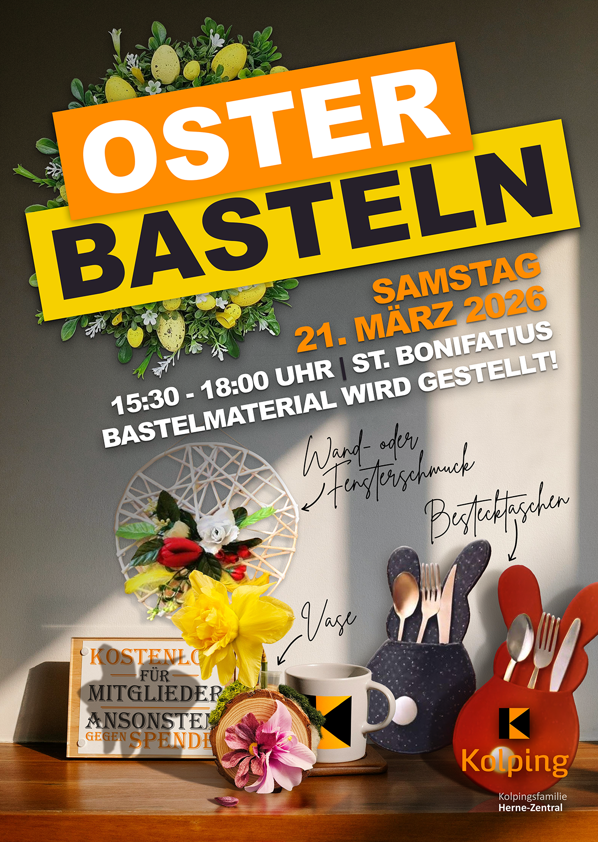Diesmal könnt ihr hübsche Wand-/Fensterdeko, Bestecktaschen aus Filz in Hasenform oder hübsche Vasen aus Naturmaterialien (Holzscheiben und Moos) basteln. Das Material stellen wir kostenfrei zur Verfügung, wir würden uns aber über einen Beitrag in unserer Spendenbox freuen.