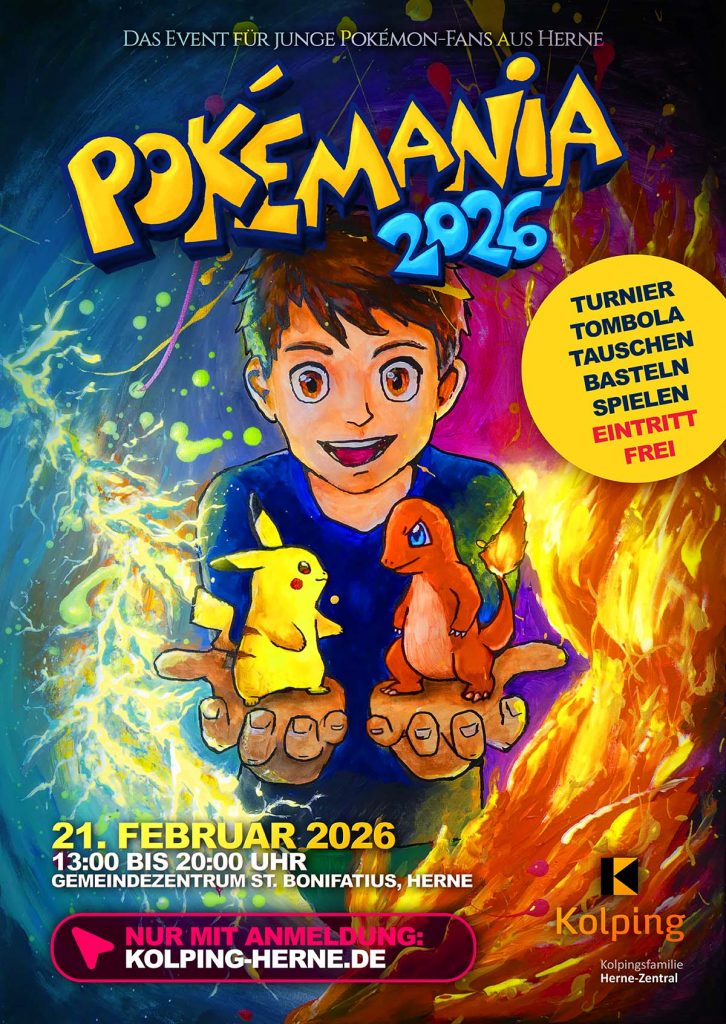 Auch in diesem Jahr lädt die Kolpingsfamilie Herne-Zentral wieder alle jungen Pokémon-Fans (6 bis 29 Jahre) aus Herne zum ultimativen Pokémon-Event ein.